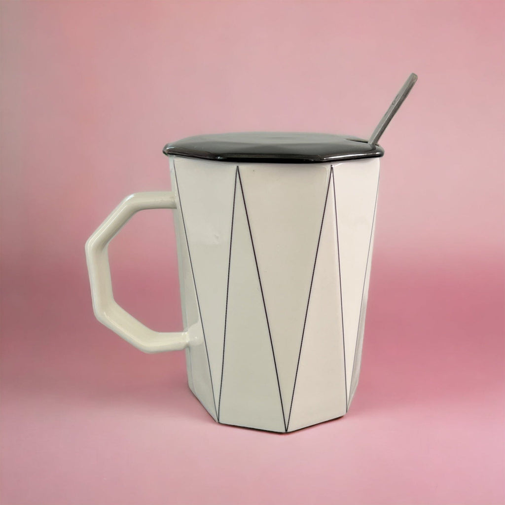Tasse en céramique géométrique blanche " Simple Life" avec cuillère en métal et couvercle céramique - Design moderne - 250 ml